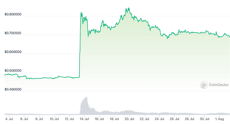 MKR, the governance token of MakerDAO, witnessed a remarkable surge of over 50% in July. This growth was prompted by the lending platform's contemplation of elevating the DAI Savings Rate to 8%, a substantial increase compared to stablecoin yields on competing lending platforms like Compound and Aave, which generally range from 2% to 3%. Meanwhile, treasury bills are yielding around 5.5%.